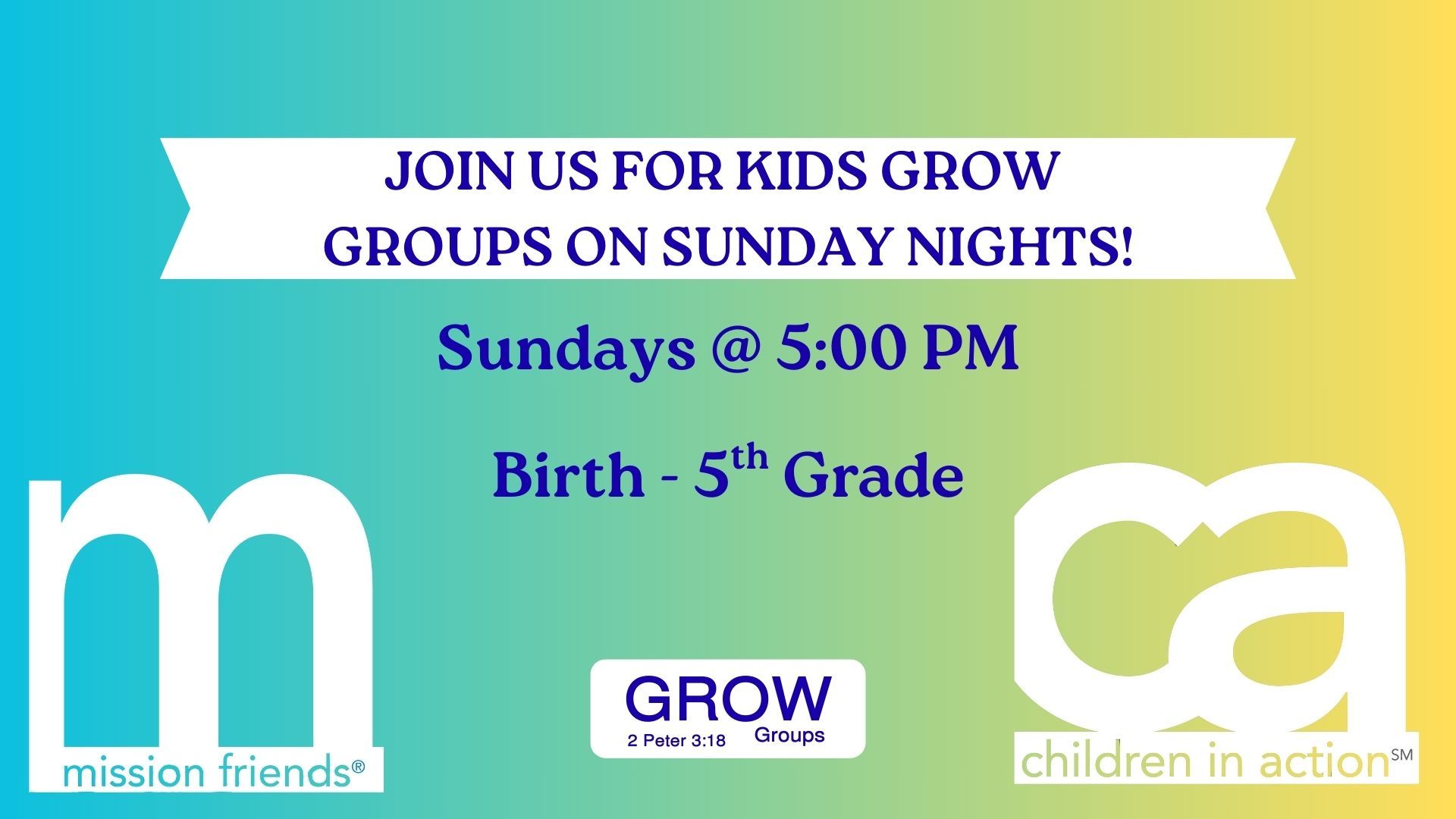 Join us on Sundays at 5:00 PM for Children in Action (K-5th) and Mission Friends (Birth-4 years old)!